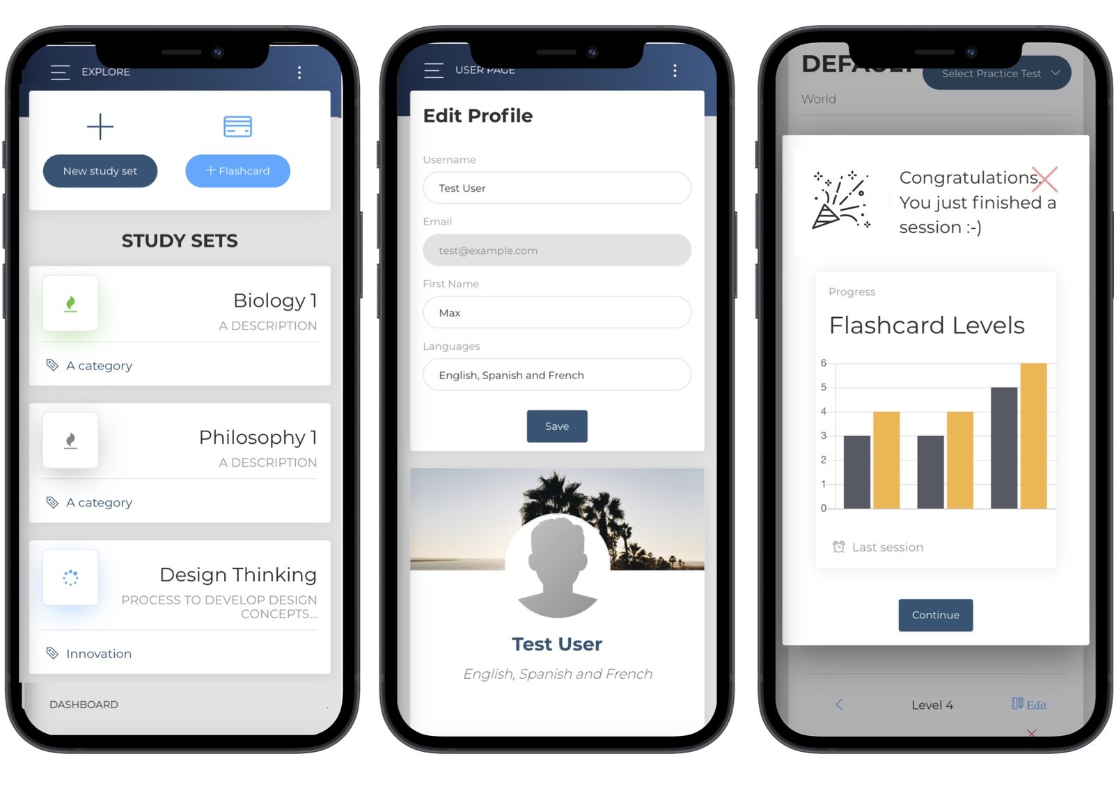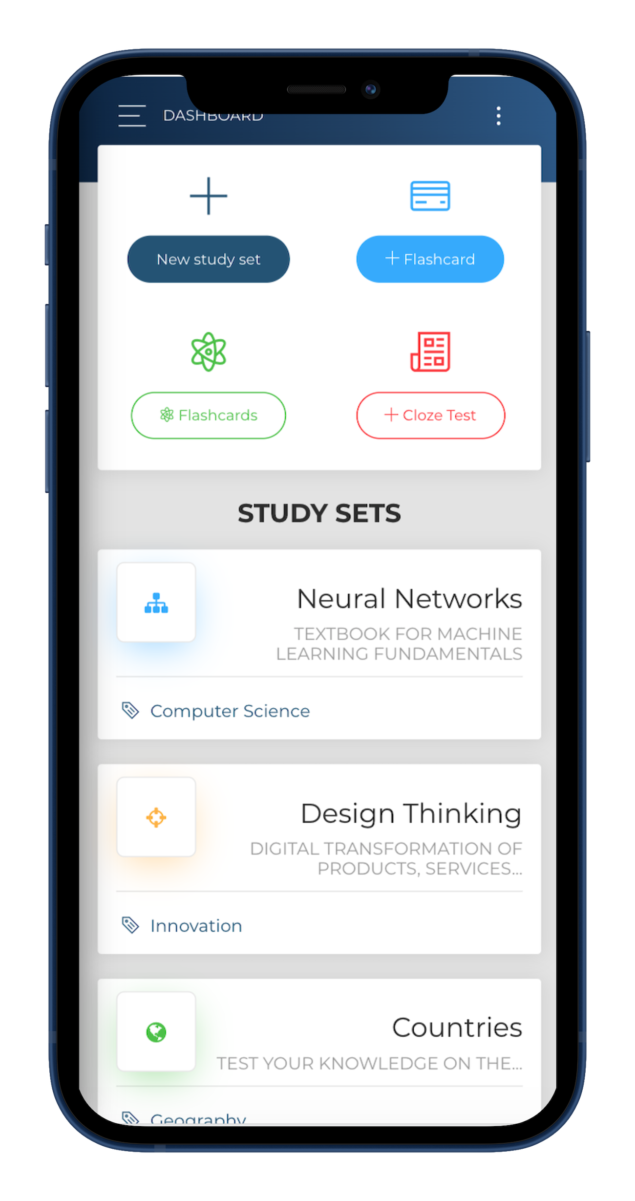 In AutoLearnify all your learning material is organized in study sets. Whether a new flashcard or cloze test is automatically generated or manually created, all learn items can be found in the corresponding study set.
